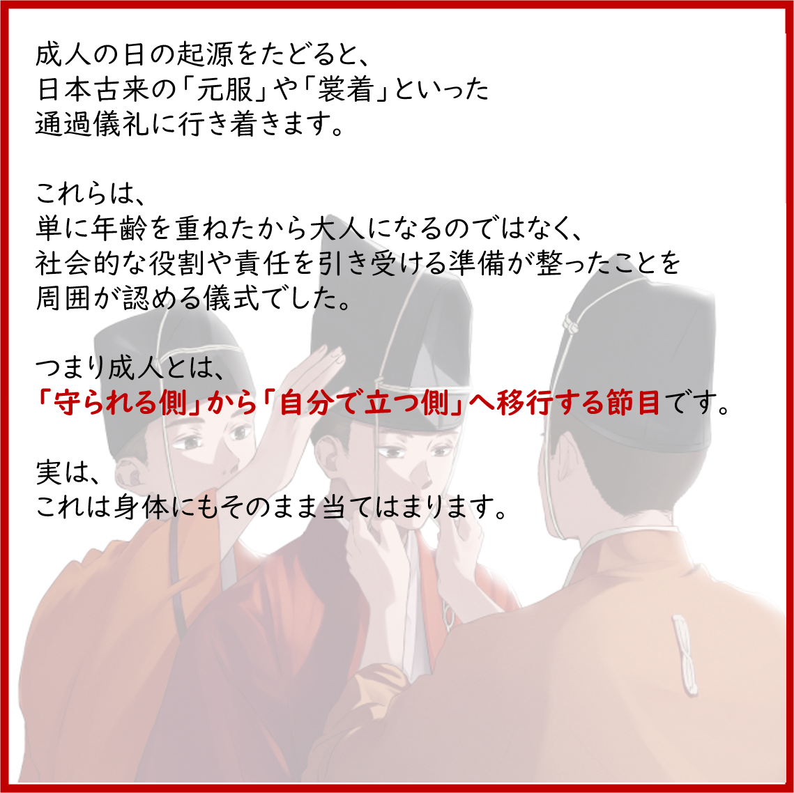 成人とは、「守られる側」から「自分で立つ側」へ移行する節目です。