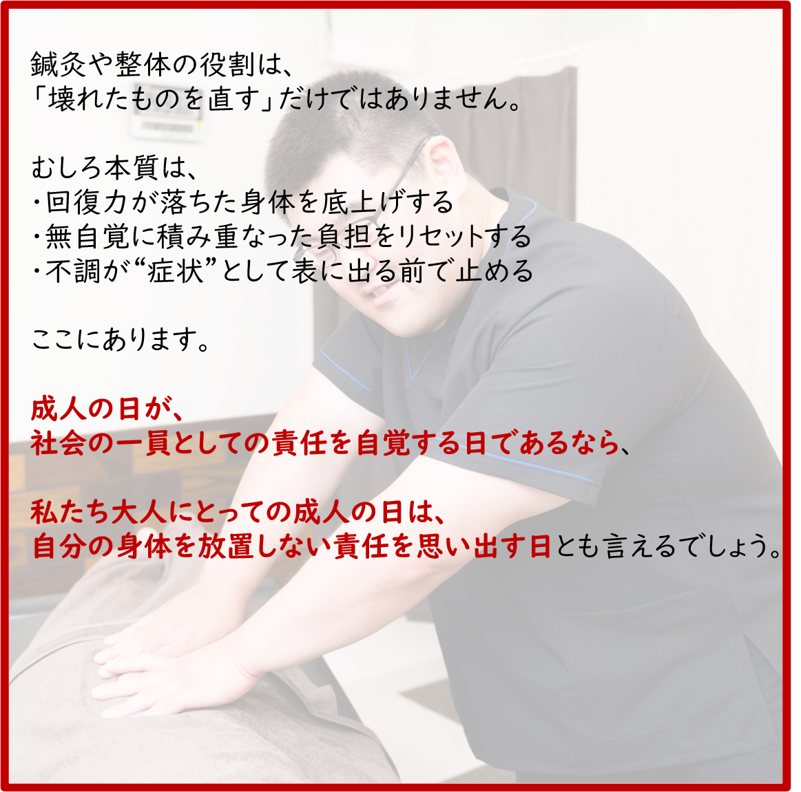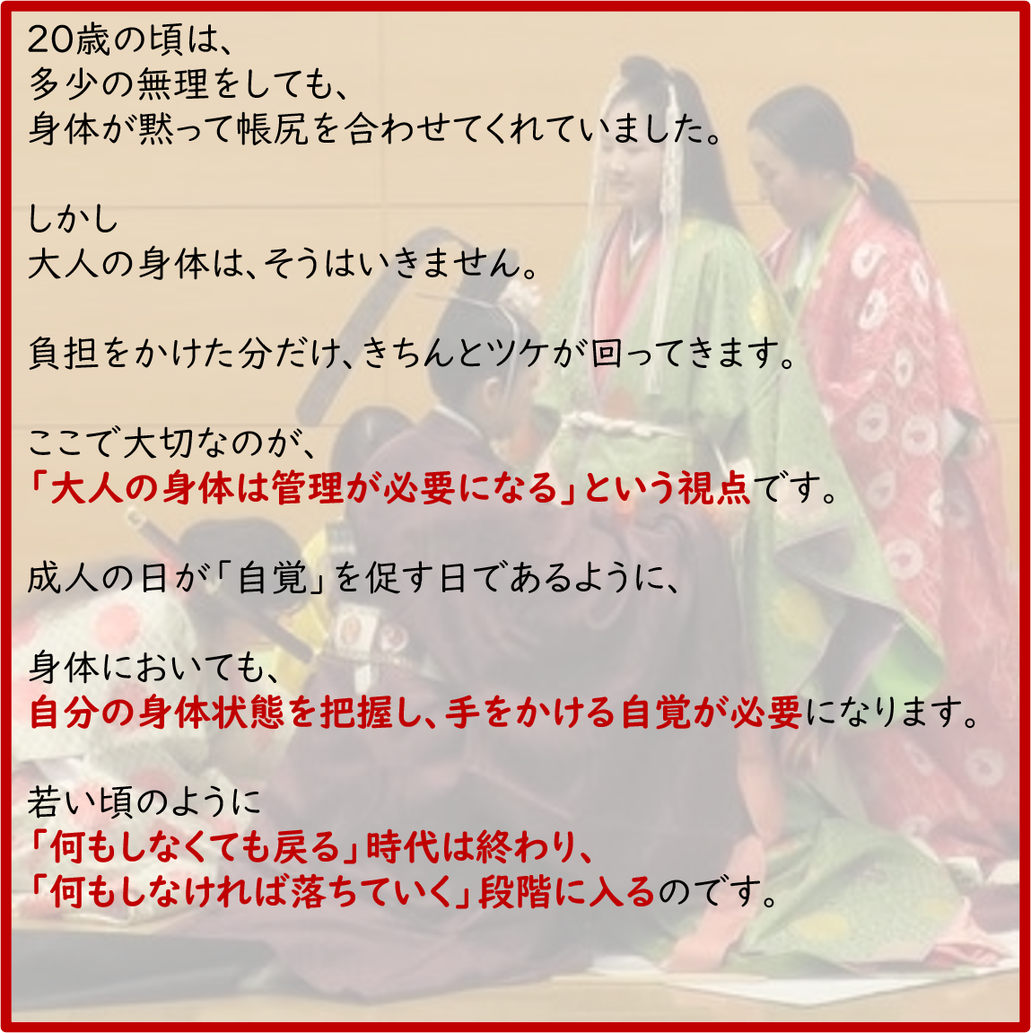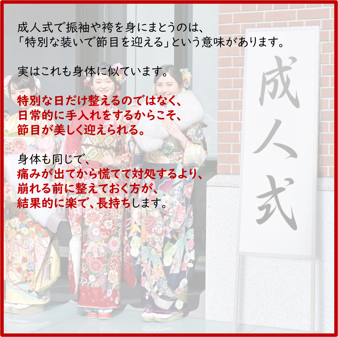 成人の日の由来に触れながら、20歳の頃と今の身体の違い、そしてなぜ定期的なメンテナンスが必要になるのかを、患者さん向けにお話しします。