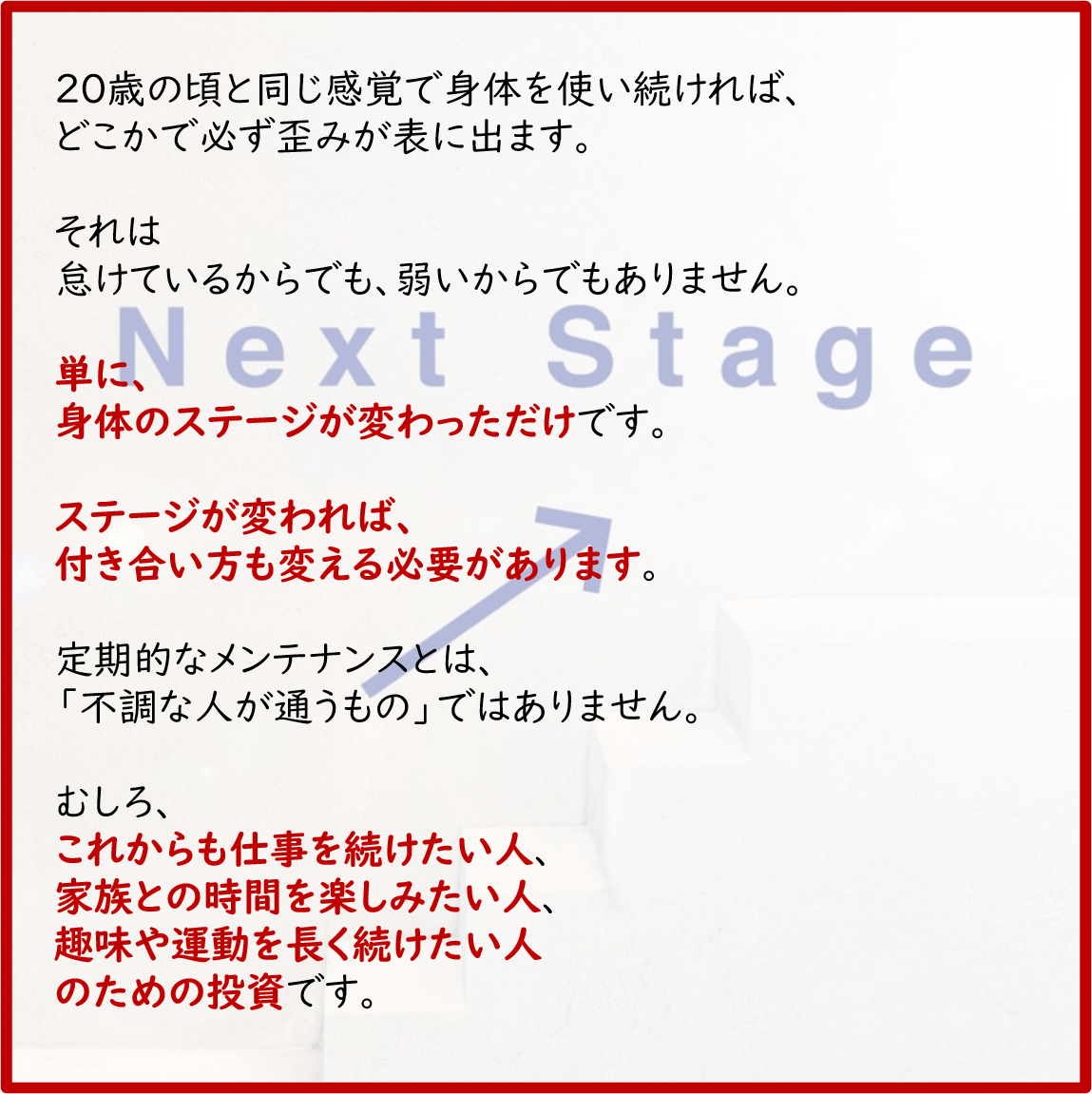 「これから先も痛みに悩まない体を作りたい」のか。