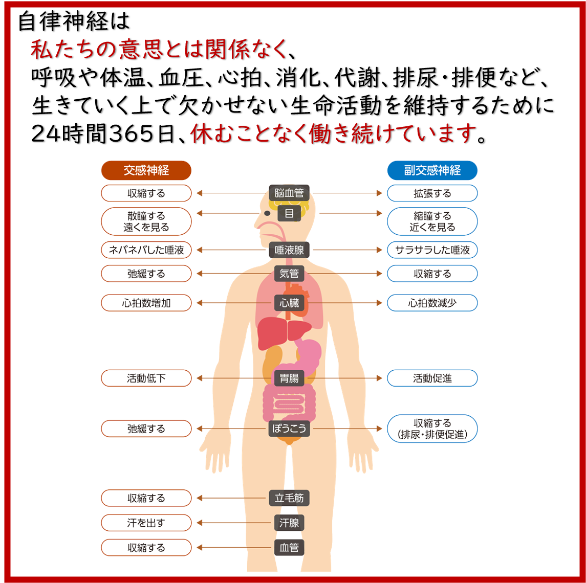 呼吸や体温、血圧、心拍、消化、代謝、排尿・排便など、