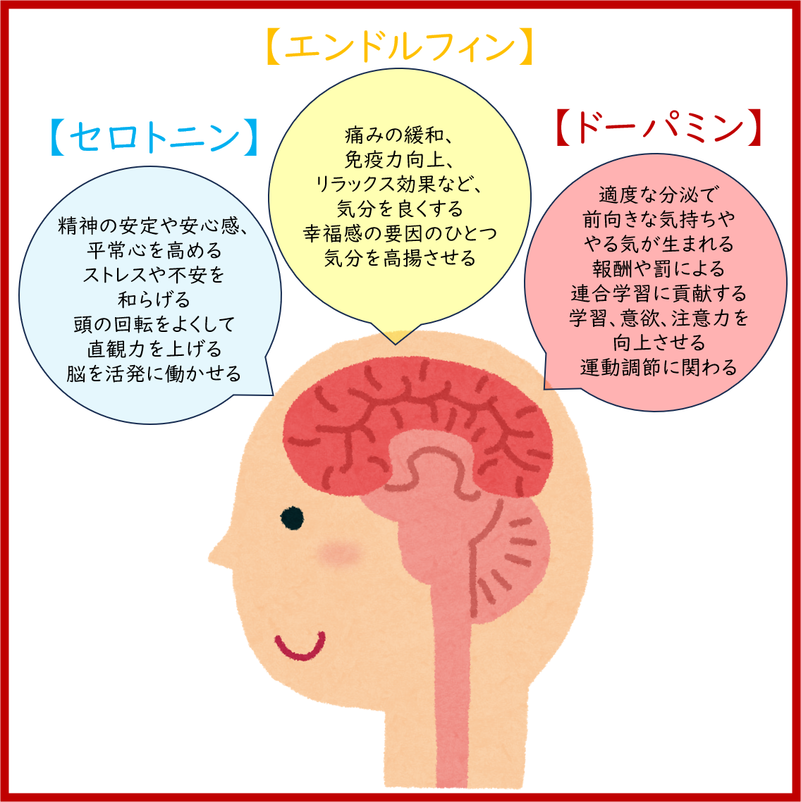 ・エンドルフィン:リラックス効果や痛みの緩和、免疫力の向上をサポートする。