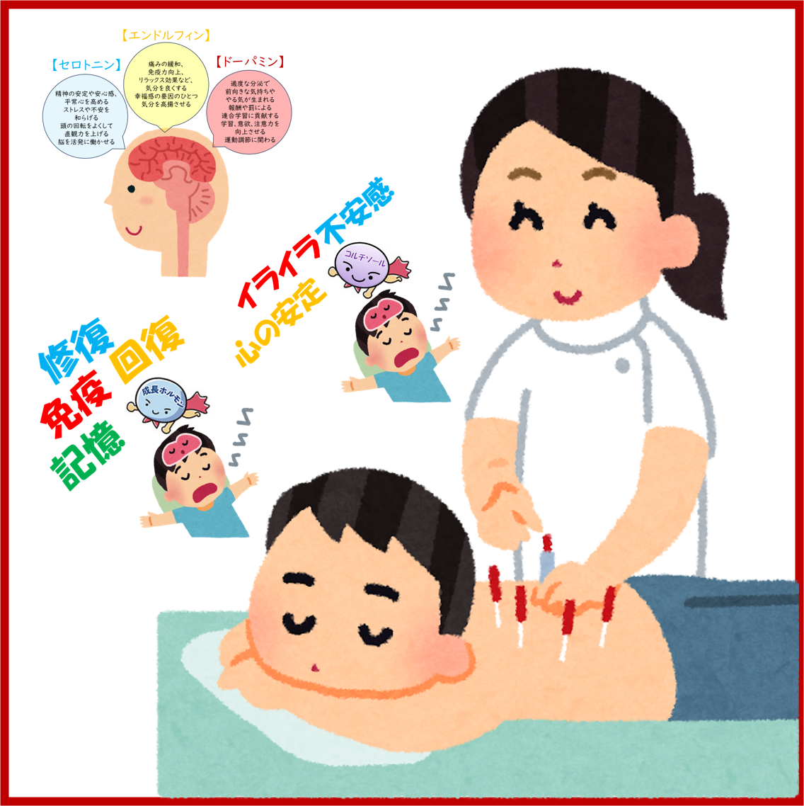 鍼灸治療は、皮膚や神経への刺激を通じて、神経やホルモンを介して脳・神経・ホルモンの働きを適正化する効果があります。