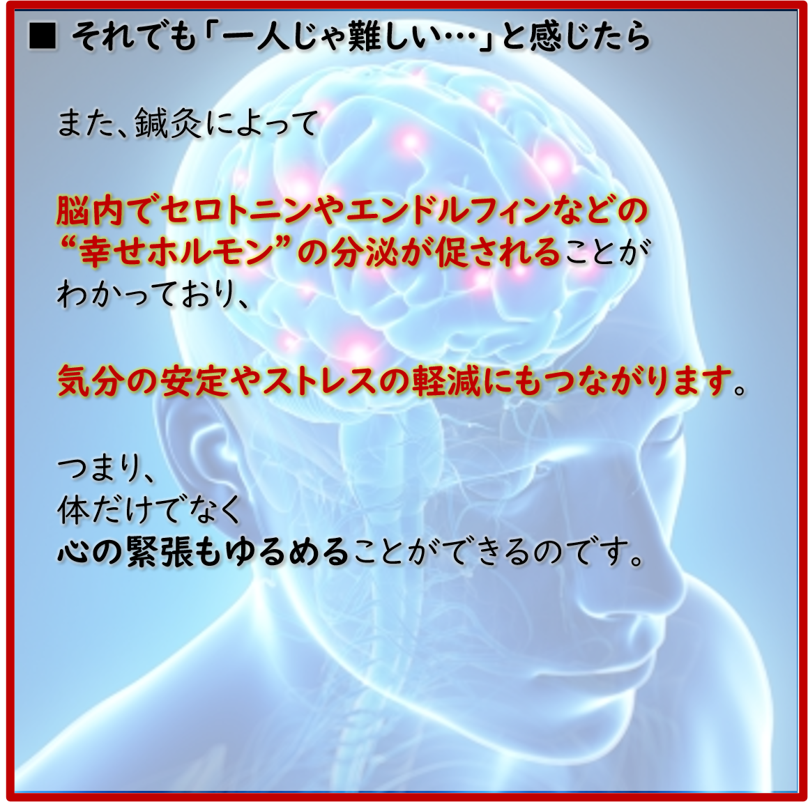 また、鍼灸によって脳内でセロトニンやエンドルフィンなどの“幸せホルモン”の分泌が促されることがわかっており、気分の安定やストレスの軽減にもつながります。