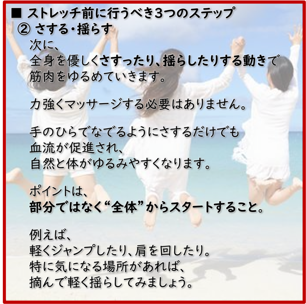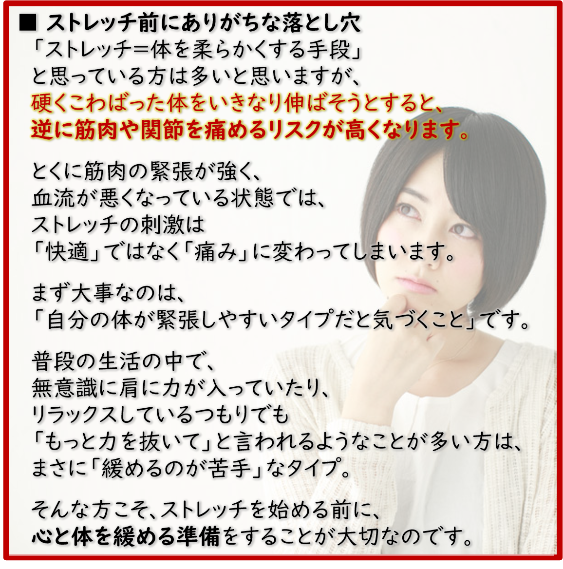そんな方こそ、ストレッチを始める前に、心と体を緩める準備をすることが大切なのです。