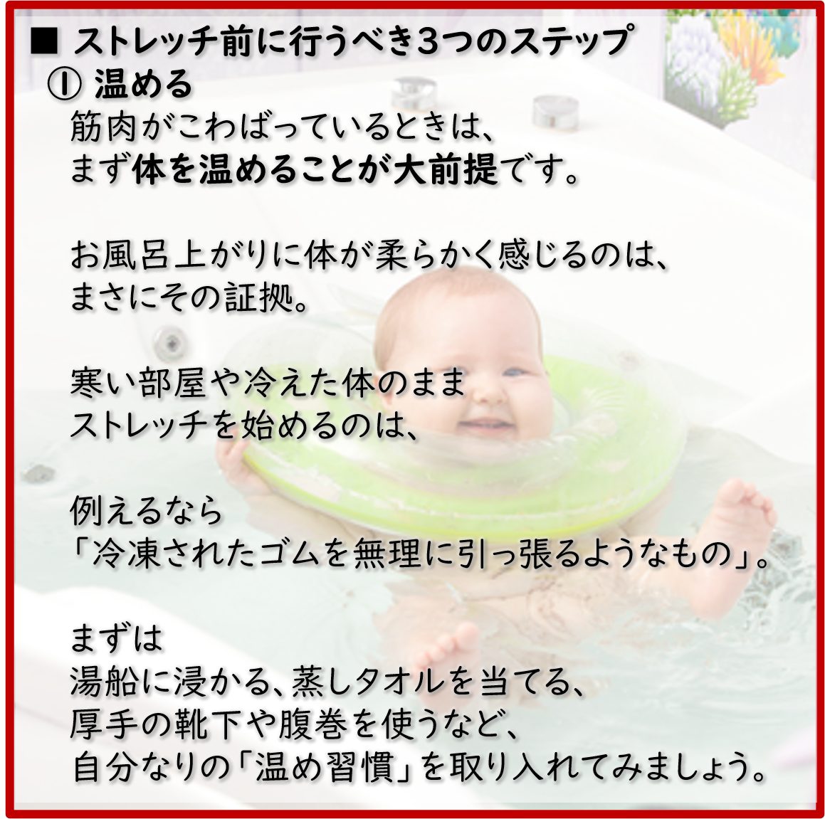 実は、ストレッチ前には“もう一歩手前の準備”が必要なのです。