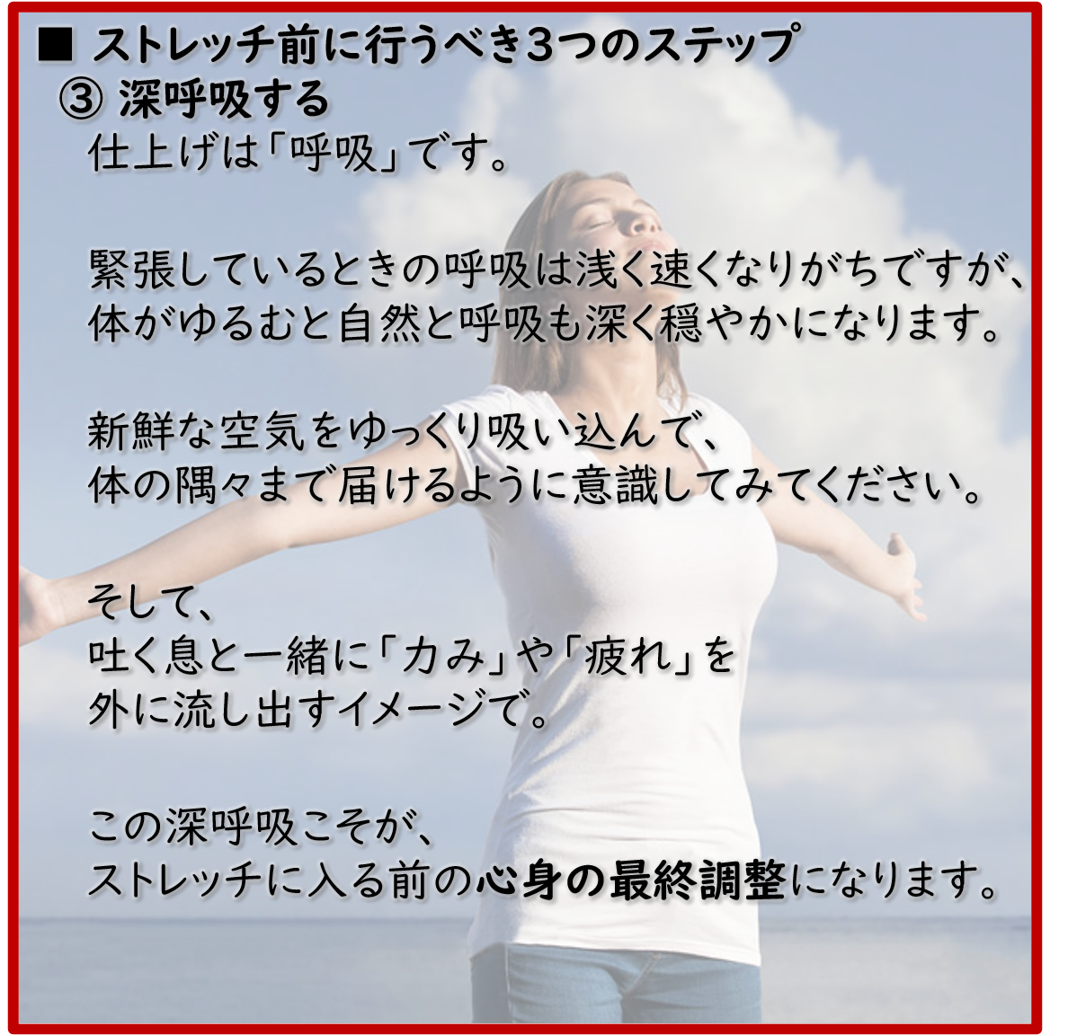 この深呼吸こそが、ストレッチに入る前の心身の最終調整になります。