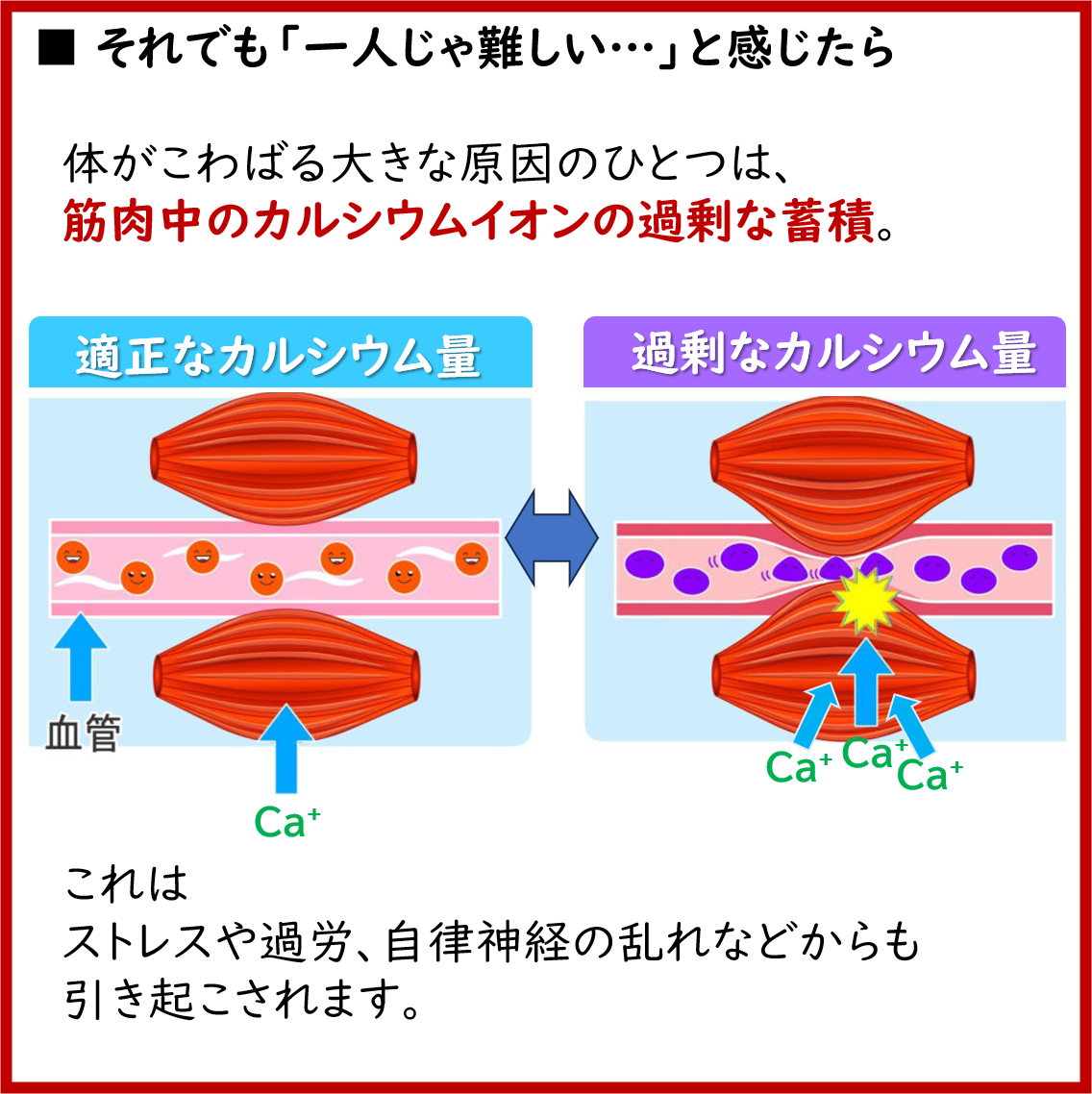 体がこわばる大きな原因のひとつは、筋肉中のカルシウムイオンの過剰な蓄積。