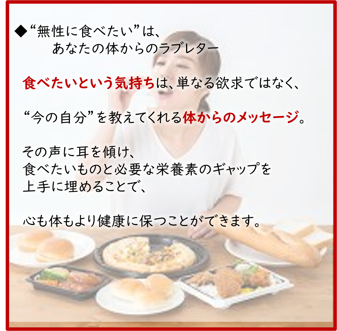 その声に耳を傾け、食べたいものと必要な栄養素のギャップを上手に埋めることで、心も体もより健康に保つことができます。