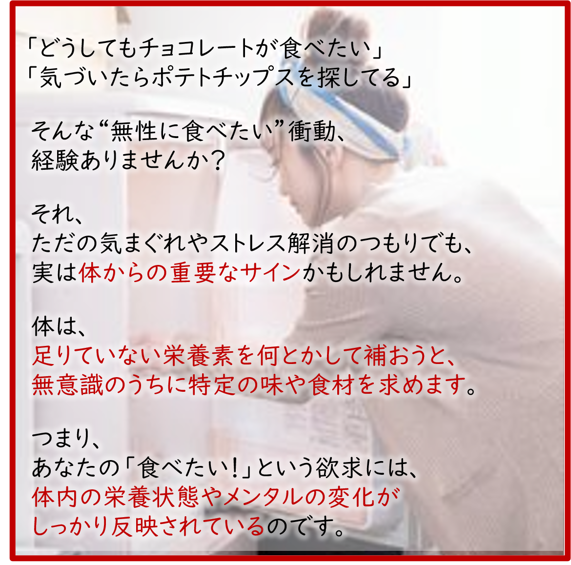 体は、足りていない栄養素を何とかして補おうと、無意識のうちに特定の味や食材を求めます。