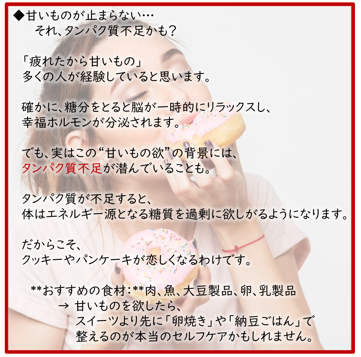 でも、実はこの“甘いもの欲”の背景には、タンパク質不足が潜んでいることも。