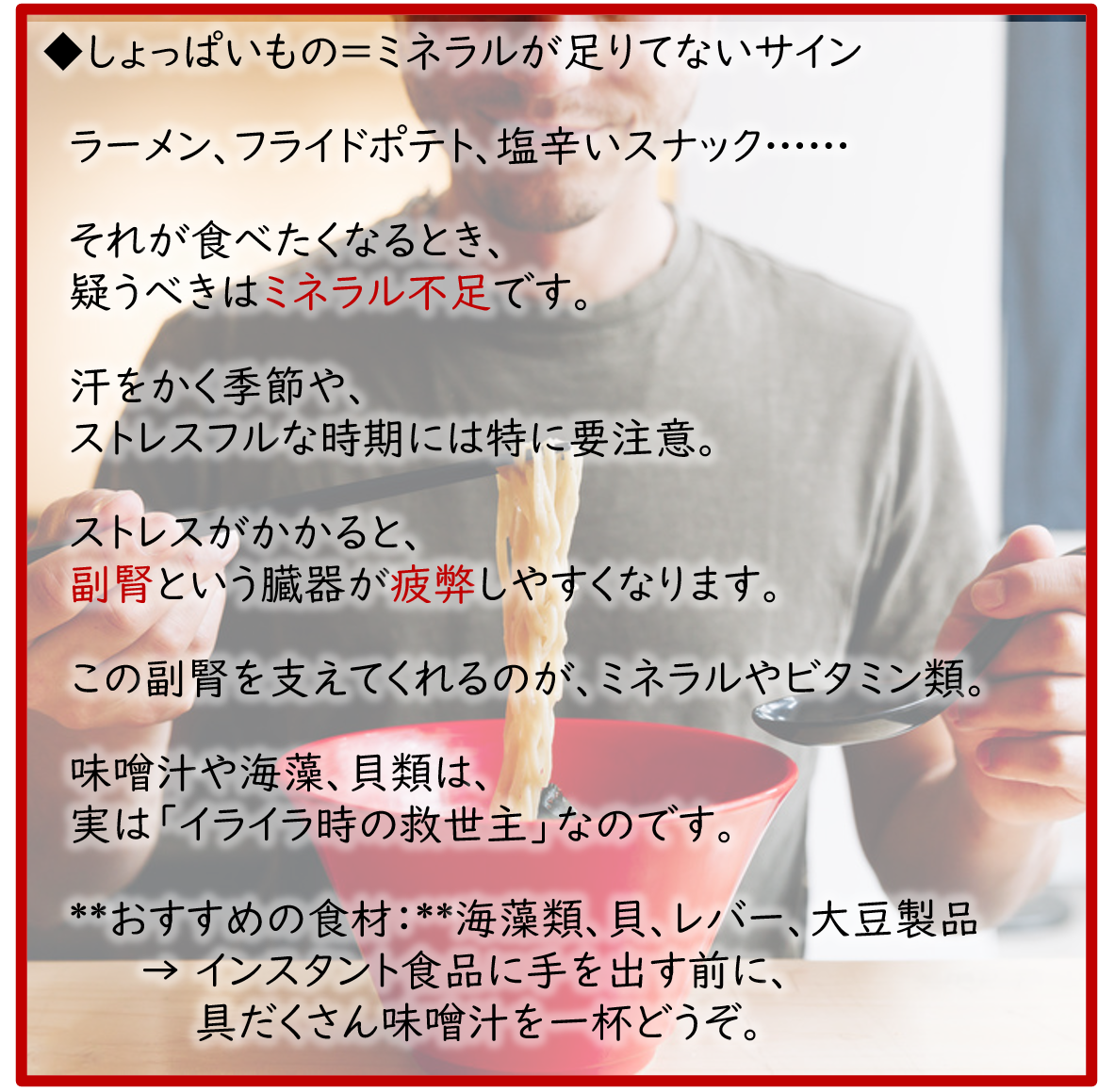 ラーメン、フライドポテト、塩辛いスナック……それが食べたくなるとき、疑うべきはミネラル不足です。