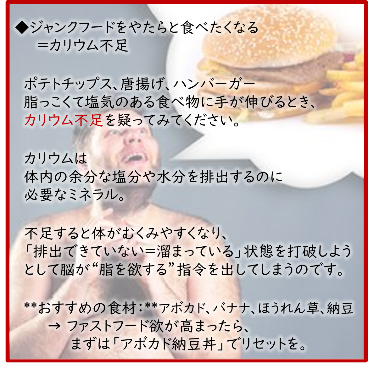 ◆ジャンクフードをやたらと食べたくなる=カリウム不足