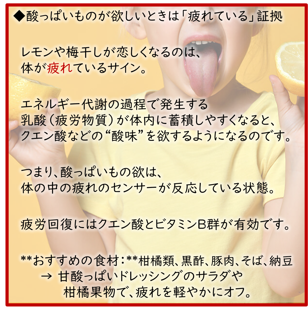 つまり、酸っぱいもの欲は、体の中の疲れのセンサーが反応している状態。