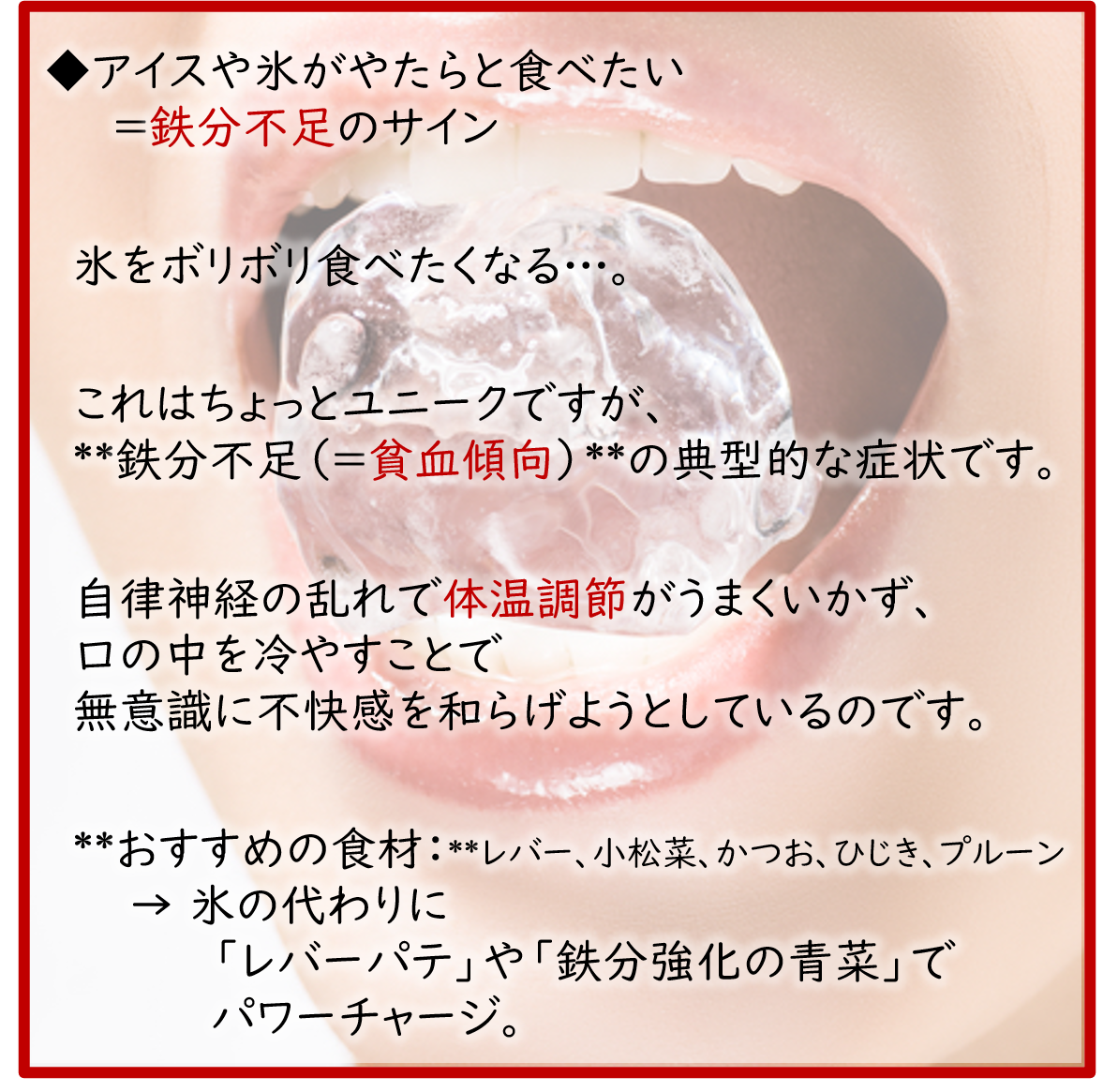 ◆アイスや氷がやたらと食べたい=鉄分不足のサイン