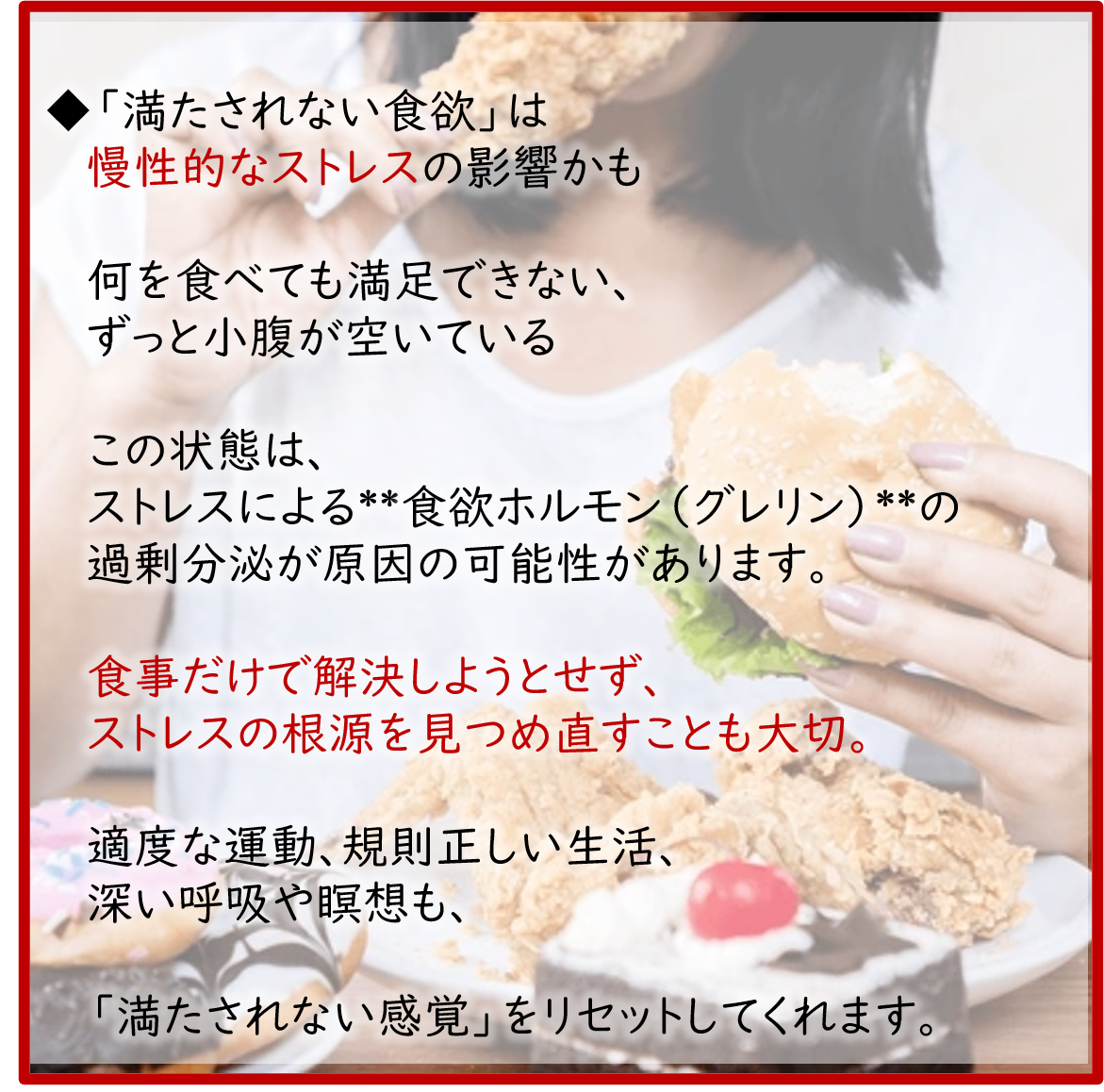 何を食べても満足できない、ずっと小腹が空いている——この状態は、ストレスによる**食欲ホルモン(グレリン)**の過剰分泌が原因の可能性があります。